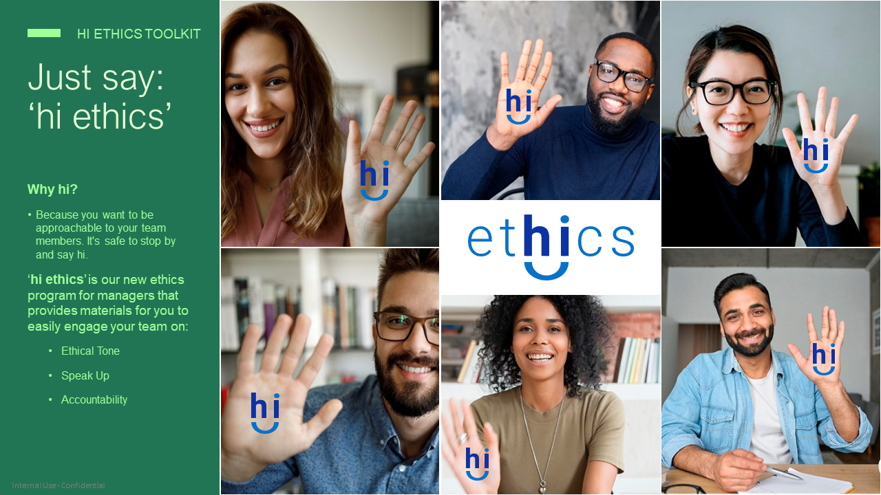Hi Ethics was used in the Leading with Integrity Program that was assigned to managers across the company. They were provided quarterly Hi Ethics Chat Packs on topics (Ethical Tone, Speaking Up, Organizational Pressure) that included scenario based discussions, videos & cartoons to workshop with their teams.