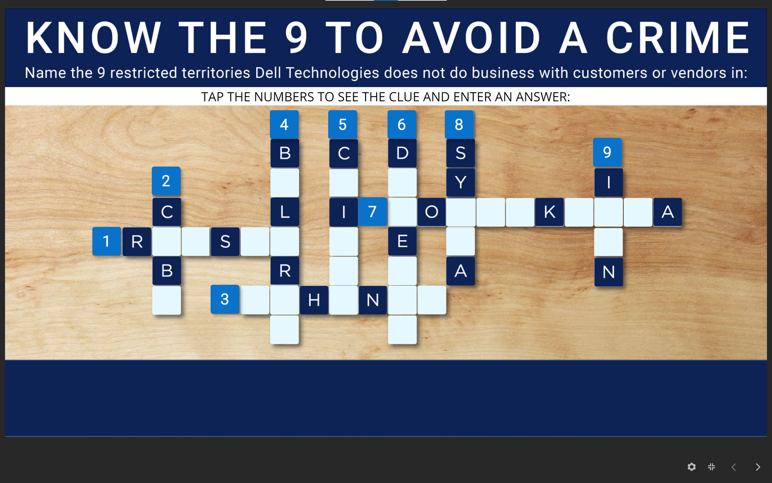 Design Process: Meet Trade Team to map out their goals. Write questions. Arrange layout of location names. Design all graphics compliant within brand guidelines. Build crossword in Articulate 360 using layers and variables. Test and launch. Because Dell adheres to a strict Location Naming Conventions (see Location Naming Convention microburst and/or Location Naming Convention job aide) no Location’s (Countries’) flags are permitted. The design solution was to use locations on a globe marked with red 3D thumbtacks.